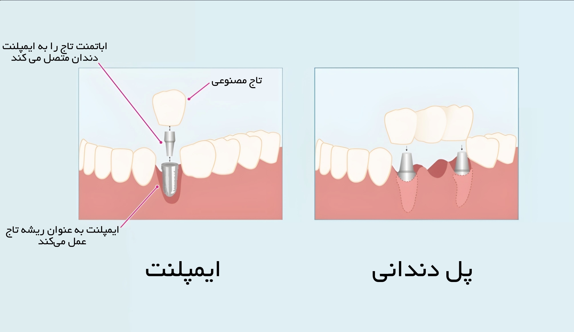 پروتز پل دندان: چنانچه فرد تمامی دندان های خود را از دست داده باشد می تواند با پروتز ثابت متکی بر ایمپلنت دندان های خود را به صورت کامل به دست آورد. بدین منظور ۸ دندان در فک پایین و ۸ دندان در فک بالا قرار داده می شود.